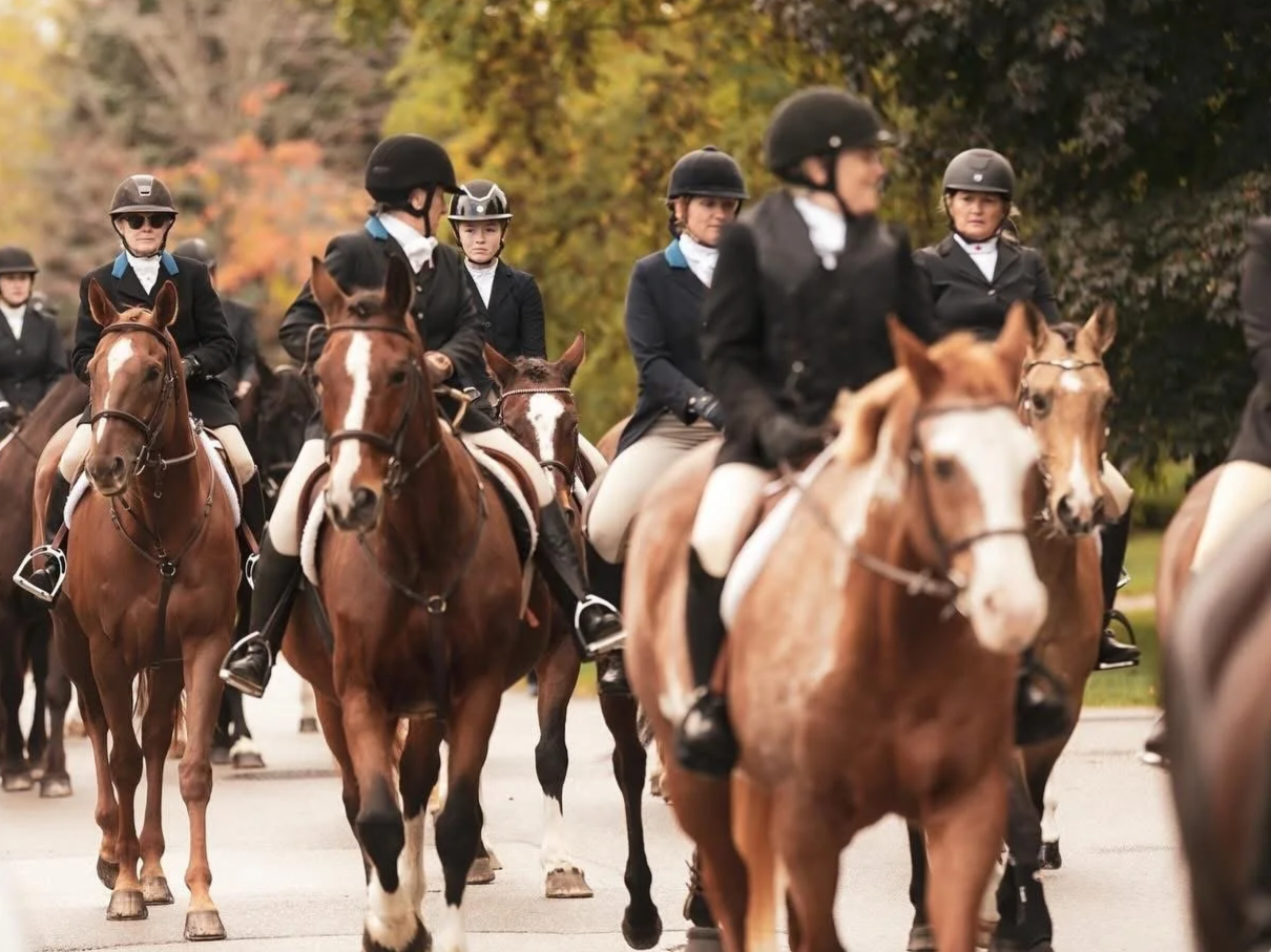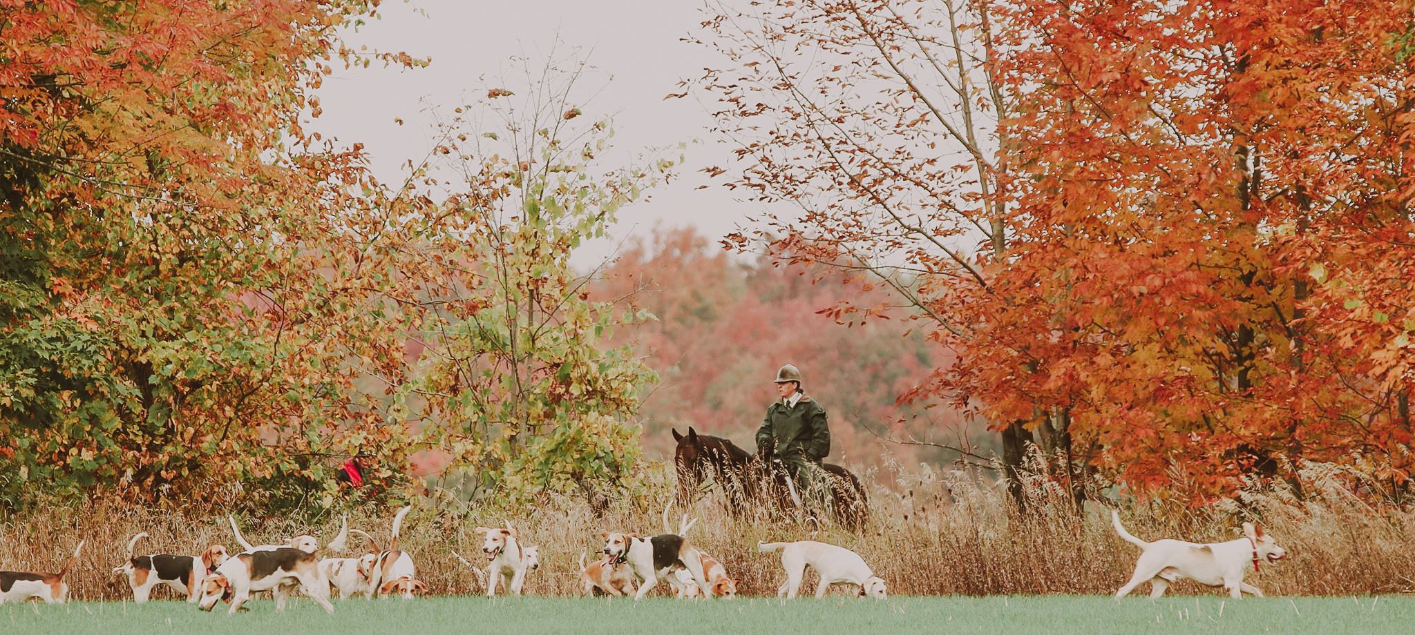 The fall season begins the Saturday after Labour Day with Opening Meet, the first formal day of the season. We wear our formal dress on Saturdays throughout the fall season. On Wednesdays, the dress is a Ratcatcher jacket, shirt and tie and riding britches. We ride into mid-November, and if the weather is favourable, we schedule some extra days for hunting. During the fall season, we have "hunt breakfasts" after the day's hunting. Sometimes we hold the breakfasts at a member's home, a close-by restaurant or pub or during nice weather; we have a tailgate breakfast at the fixture. On the Thanksgiving weekend Saturday, we traditionally have the Horse, Hound and Harvest Parade, where we parade the hounds and horses through downtown Creemore. On Thanksgiving Monday, we enjoy the fall colours with a Hunter Pace with a scenic ride.